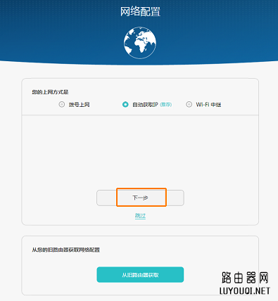 说明:如果忘记帐号密码请联系宽带运营商或者点击“从旧路由器获取”,根据屏幕提示,可自动从旧路由器获取宽带帐号密码(旧路由器以前设置过正确的宽带帐号密码)。