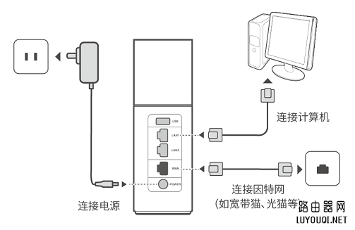 用网线连接路由器LAN接口和计算机(如果您希望通过笔记本电脑、平板、手机等无线方式配置路由器,此处可不连计算机)。