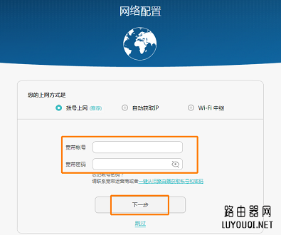 如果上网方式为“宽带帐号上网”(拨号上网),请输入“宽带帐号”和“宽带密码”,点击“下一步”。