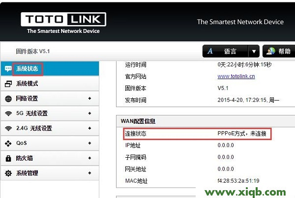 选择菜单“高级”——>“查看路由器与因特网的连接情况”,如下图,因特网端口获取到IP 地址,说明路由器与Internet 连接成功。这时就可以上网冲浪啦!
