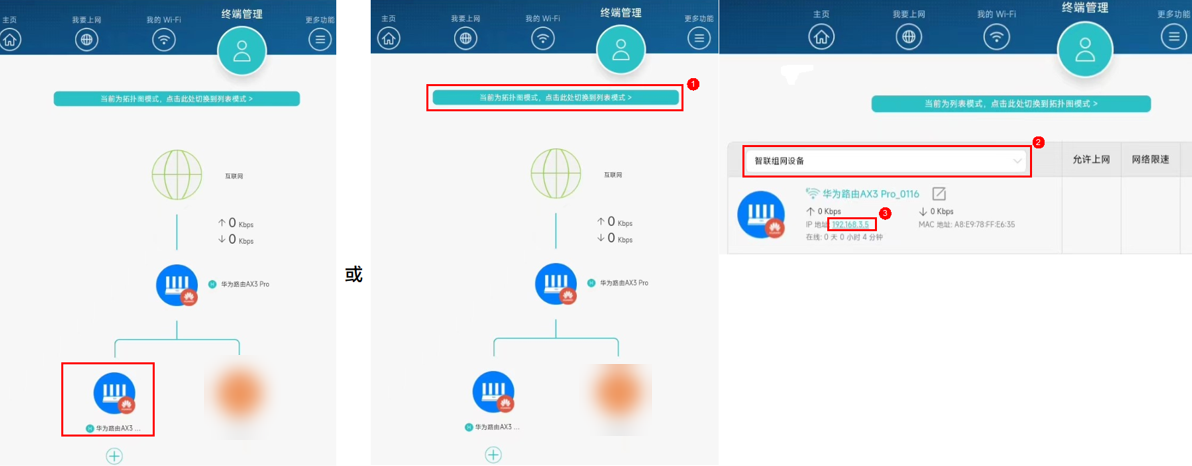 3. 点击终端管理,选择对应的副路由(或是在终端管理页面切换到列表模式,选择智联组网设备后,点击副路由的 IP),界面将会跳转到副路由的管理页面。