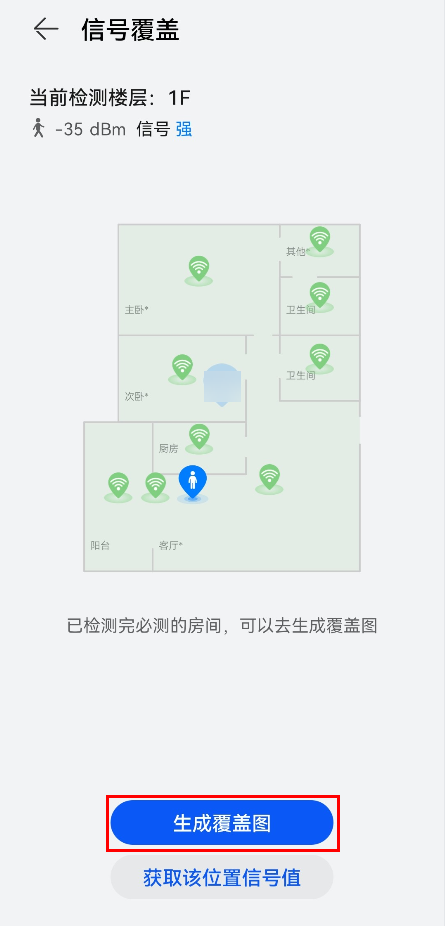 2. 请拖动定位图标至检测位置,保持手机和路由器的 Wi-Fi 连接,手持手机移动到需要检测的位置并点击获取该位置信号值,接着每换到一个房间就点击一次获取该位置信号值,直到检测完所有必测的房间,就可以点击生成覆盖图,生成信号覆盖图,绿色代表强信号。