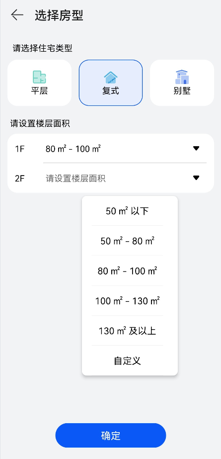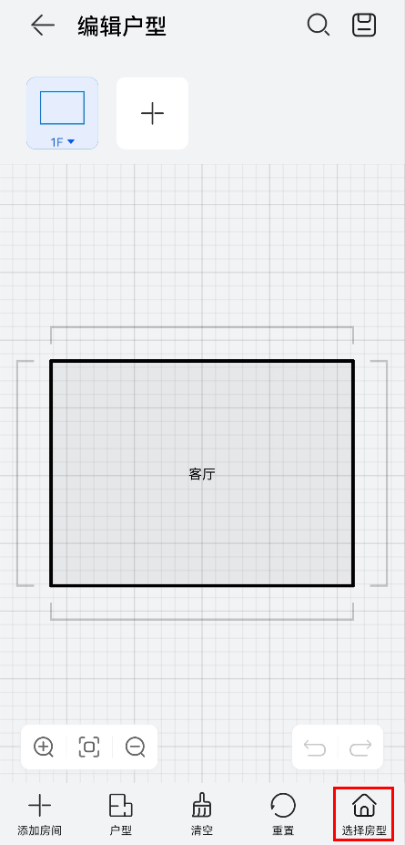 o 点击右下角的选择房型,先选择住宅类型,设置各楼层面积,点击确定,然后按照手动编辑户型图方法完成楼层户型编辑。
