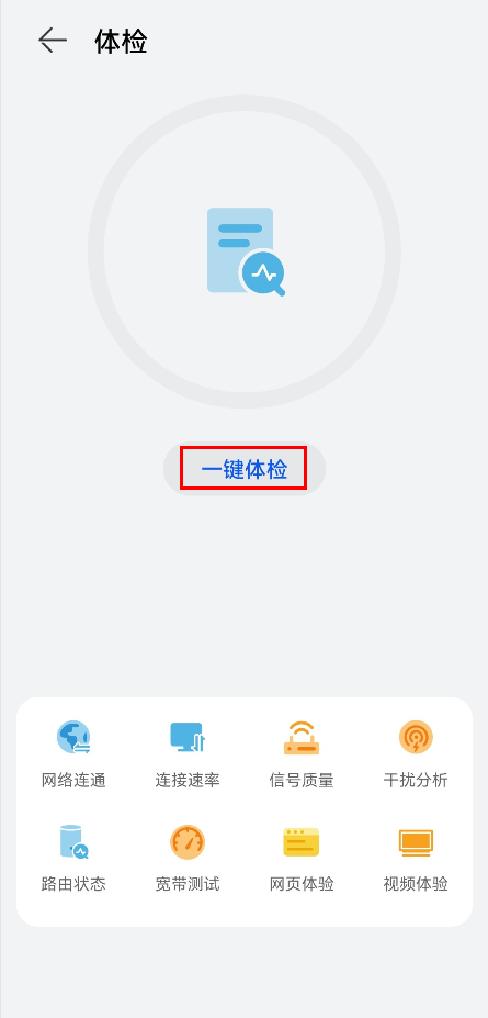 在智能检测页面,点击底部的体检,进入体检界面,点击一键体检,自动检测网络连通、连接速率、信号质量、干扰分析、路由状态等情况(路由器的支持的体检项目不同,请以实际界面为准。),体检完成后生成体检结果报告,您可以根据报告给出的具体问题和修改建议,优化路由器设置(部分体检项检测内容与当前的网络环境有关,未提供优化选项。)。