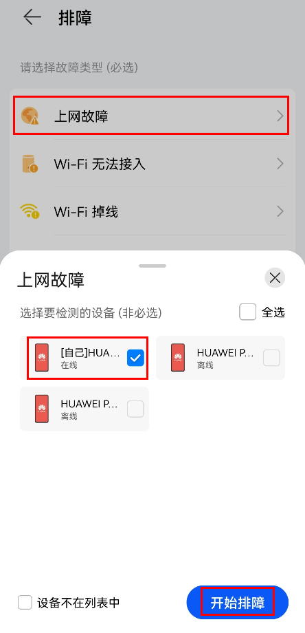 3. 选择要检测的设备(非必选),点击开始排障。点击给出的建议,优化路由器设置。