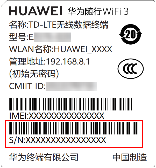 您可以通过设备机身底部或背部(部分产品需打开电池后盖查找)的铭牌,查看相应的S/N码,此处以华为随行WiFi 3的铭牌为例: