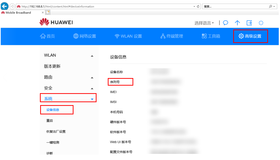 手机或电脑连接到设备的Wi-Fi,在浏览器地址栏中输入“192.168.8.1”,然后输入登录密码进入设备的管理页面,依次点击高级设置>系统>设备信息,即可在该页面查看设备信息,其中序列号一项即为设备的S/N码。
