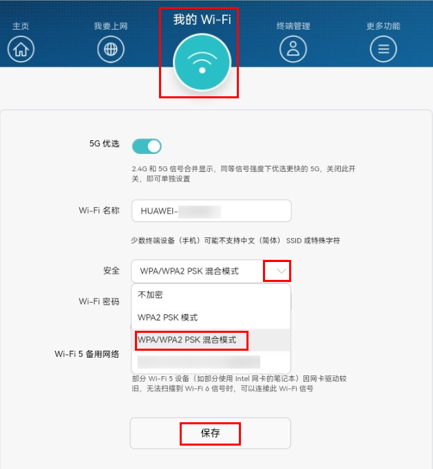 3. 点击我的 Wi-Fi,在安全这一栏修改路由器的加密方式,点击保存,即可生效。