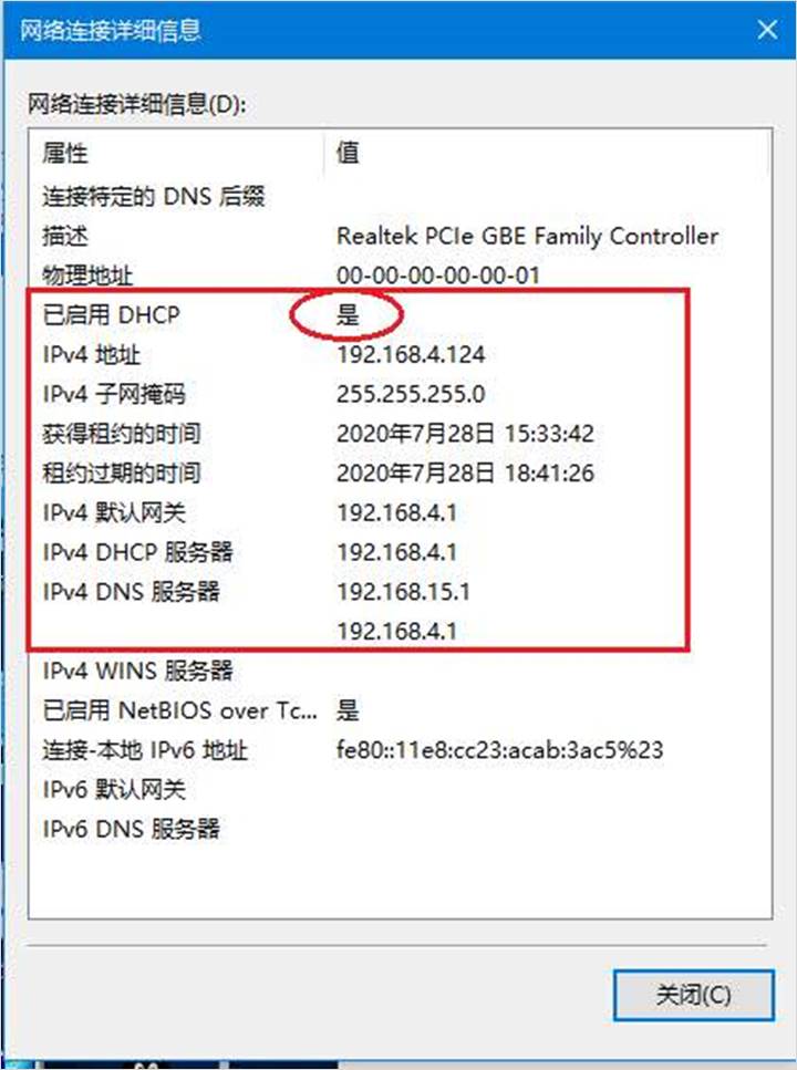 在详细信息的列表中确认已开启DHCP为“是”,如下图:
