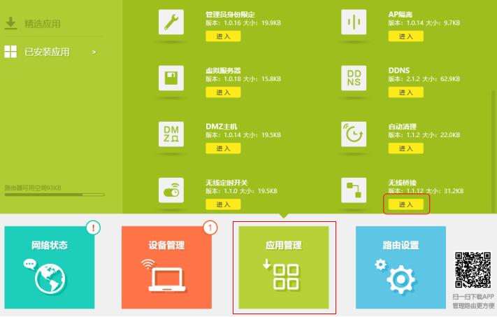 进入管理界面后,点击“应用管理”,在已安装应用中找到“无线桥接”,点击“进入”。如下: