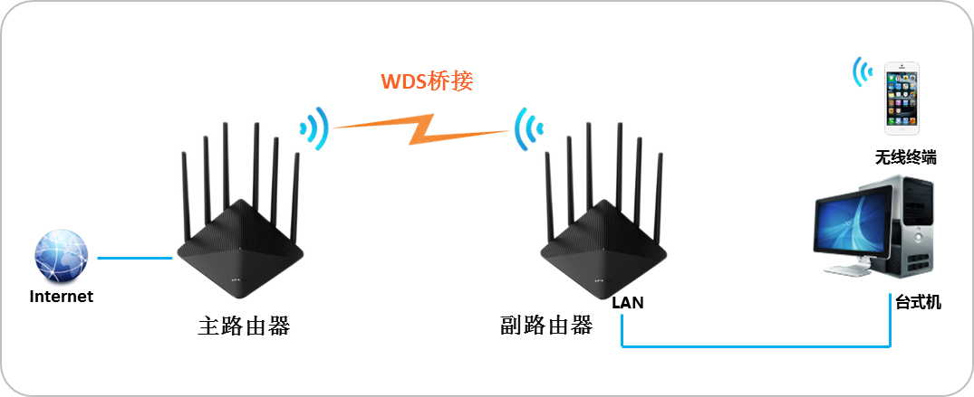 一些距离主路由较远的台式机无法直接连网线,往往会通过无线网卡来接收无线信号上网。而距离较远时,无线网卡的接收能力较弱,无线体验可能不佳。此时也可以通过WDS来扩展网络,较远的台式机可以通过有线连接到副路由器的LAN口上网,如下图: