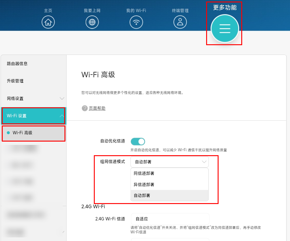 o 组网信道模式(仅部分路由器支持,具体请以页面显示为准):设置多路由器组网场景下,不同路由器生效 Wi-Fi 信道的方式。若选同信道部署,所有组网路由器保持 Wi-Fi 信道一致、提升 Wi-Fi 设备移动漫游体验;若选异信道部署,路由器会自动为组网路由器选择差异化的 Wi-Fi 信道、减少路由器之间的 Wi-Fi 信号干扰;若选自动部署,路由器会自动为组网路由器选择相同信道或差异化信道。