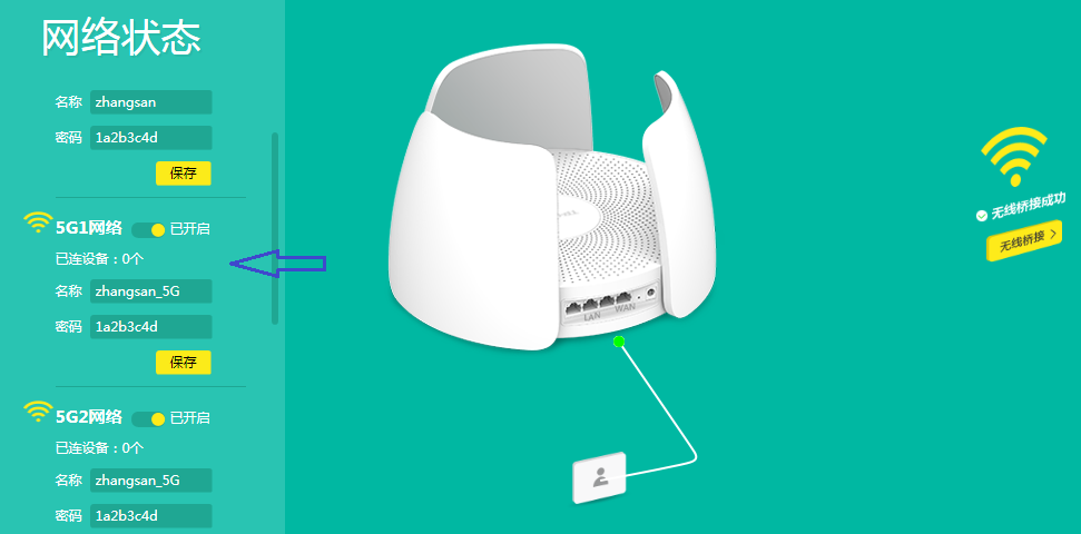 至此无线桥接(WDS)设置完成,无线终端连接zhangsan_5G,有线电脑连接主、副路由器的LAN口即可上网。终端移动过程中,可以实现主、副路由器间的自动漫游。