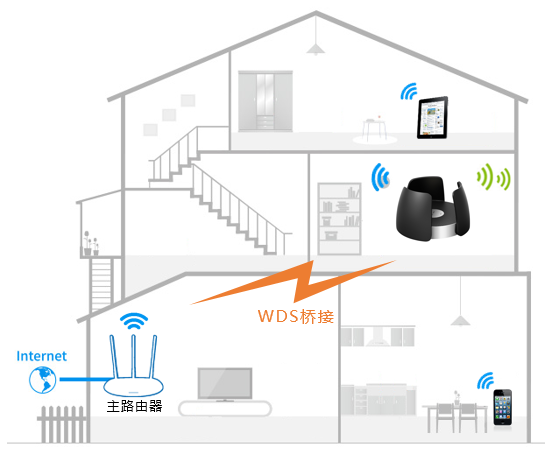 在面积较大的环境(如四室两厅、复式、写字间等),单台路由器无线覆盖范围有限,部分区域可能会信号较弱或存在信号盲点。无线桥接(WDS)可以将多台无线路由器通过无线方式互联,从而将无线信号扩展放大。无线终端在移动过程中可以自动切换较好的信号,实现无线漫游。
