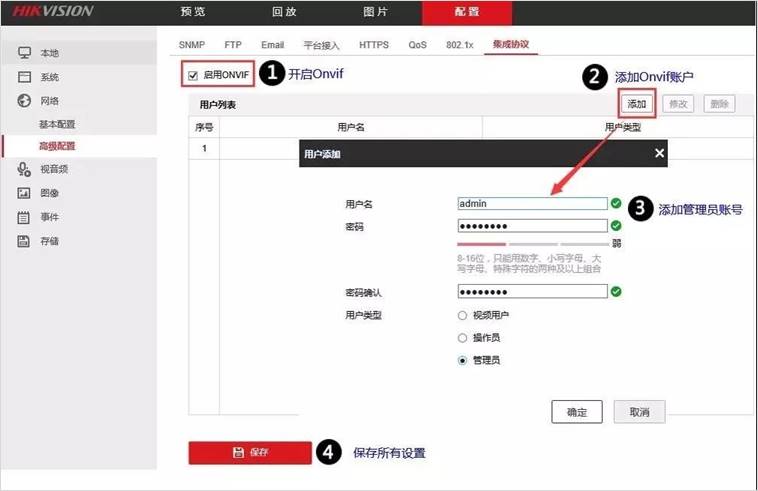 3.点击【添加】,设置一个Onvif账号,用户类型必须为管理员;